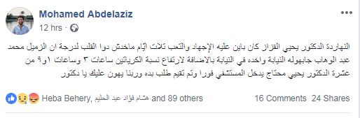 يقول محمد عبد الوهاب عضو هيئة الدفاع عن الدكتور يحيى القزاز على صفحته على موقع “فيس بوك”، أمس الأربعاء، إن موكله لم يتناول دواء القلب لمدة 3 أيام.